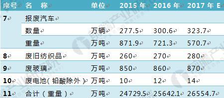 圖表2:2015-2017年我國主要再生資源類別回收利用表二(單位:萬噸,萬輛)